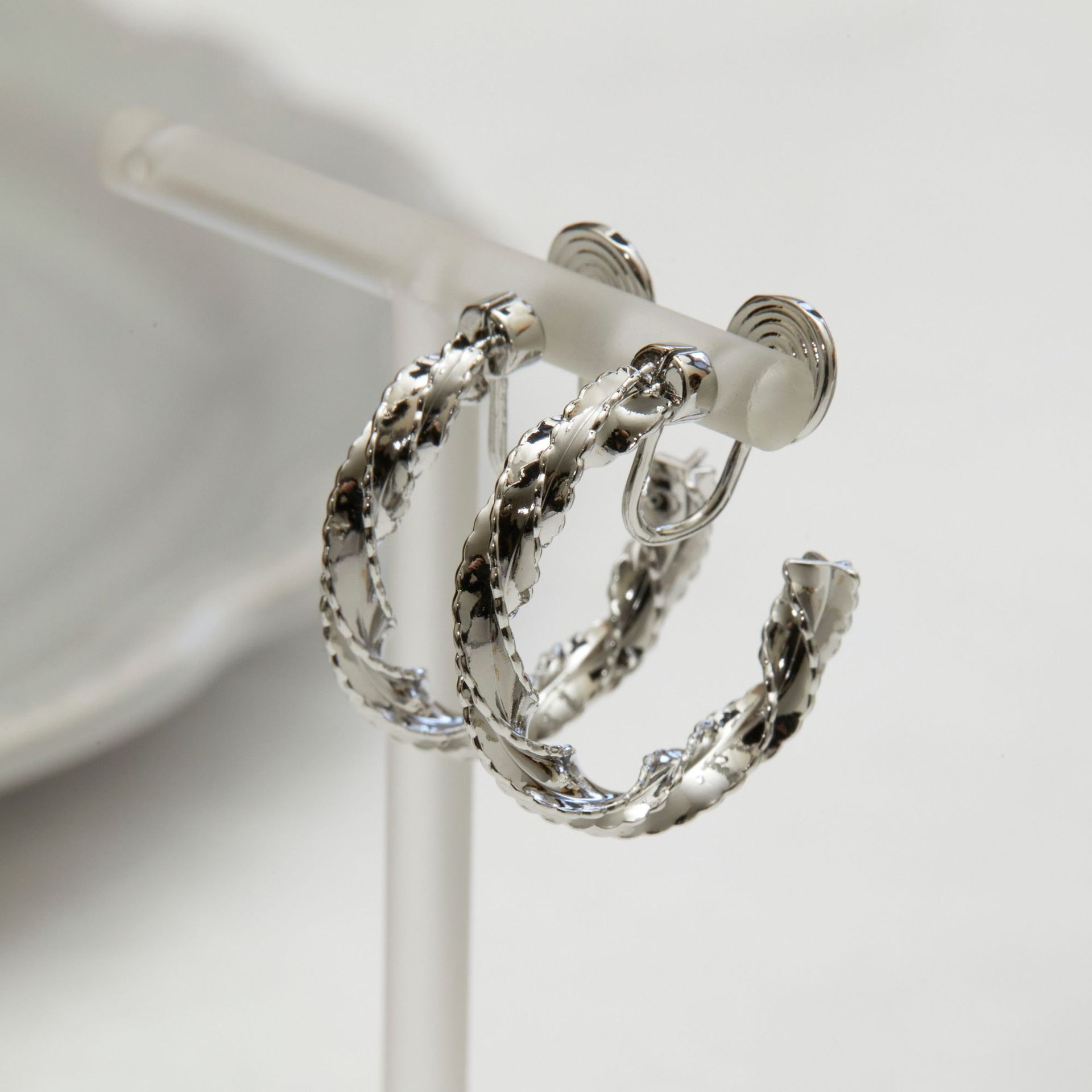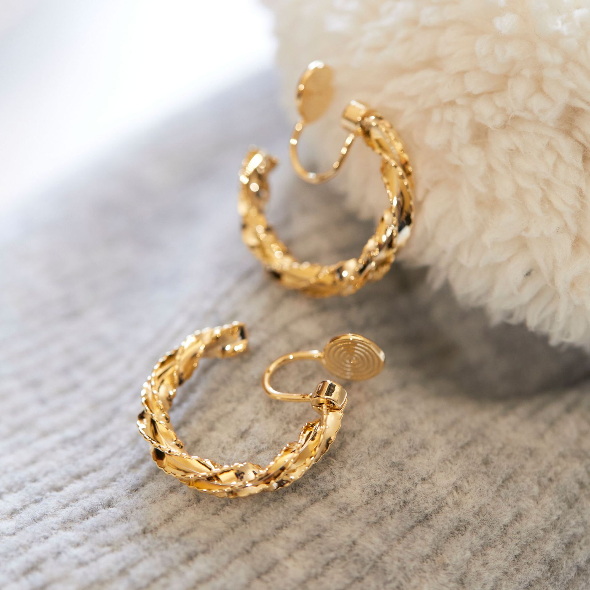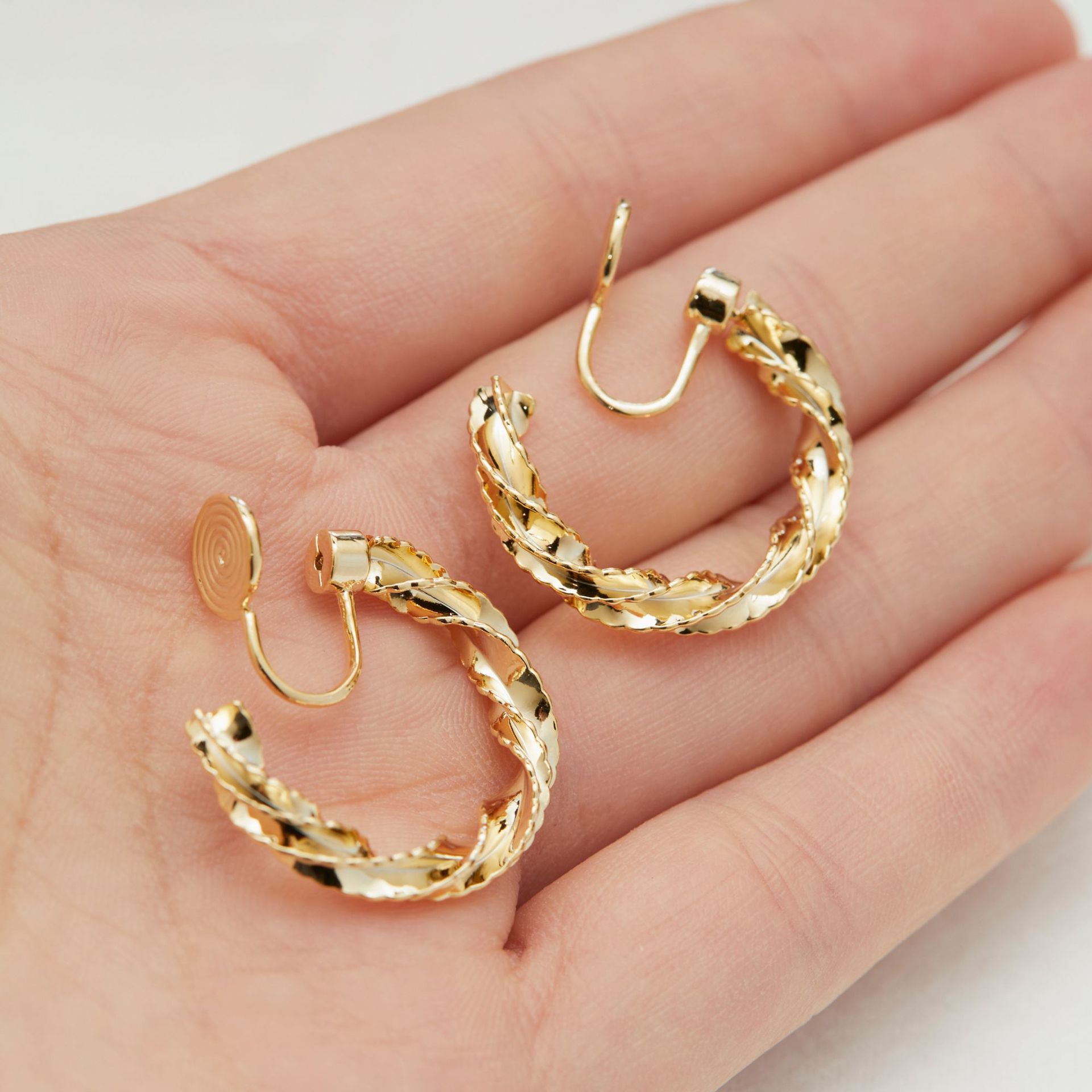 Colors: A pair of silver stud earrings, a pair of silver clip-on earrings, a pair of gold stud earrings, a pair of gold clip-on earrings